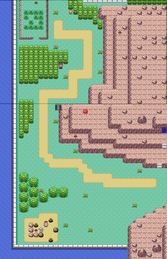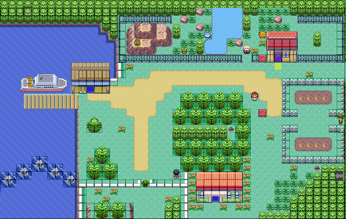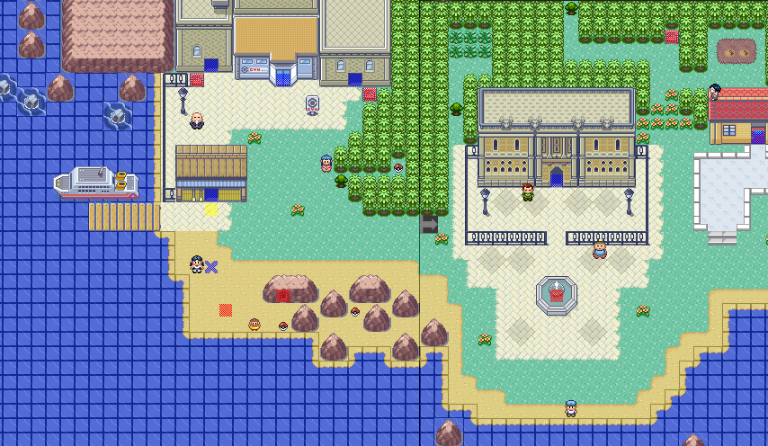 This is the dock of the Legendary Luxe Resort. The 1st gym leader, Clay is awaiting your challenge. His experience as a groundskeeper for Mr. Edward before taking residency on the Island has made Clay hard as stone. On the beach you’ll find a girl and her little brother both with shared interest in treasures.